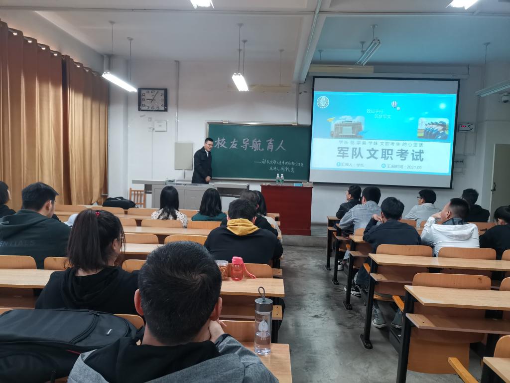 特别邀请成功上岸校友周乾秀于2021年5月2日上午,在14号教学楼201教室举办了部队文职人员考试面试经验分享会,会议由就业辅导员王永文老师主持。