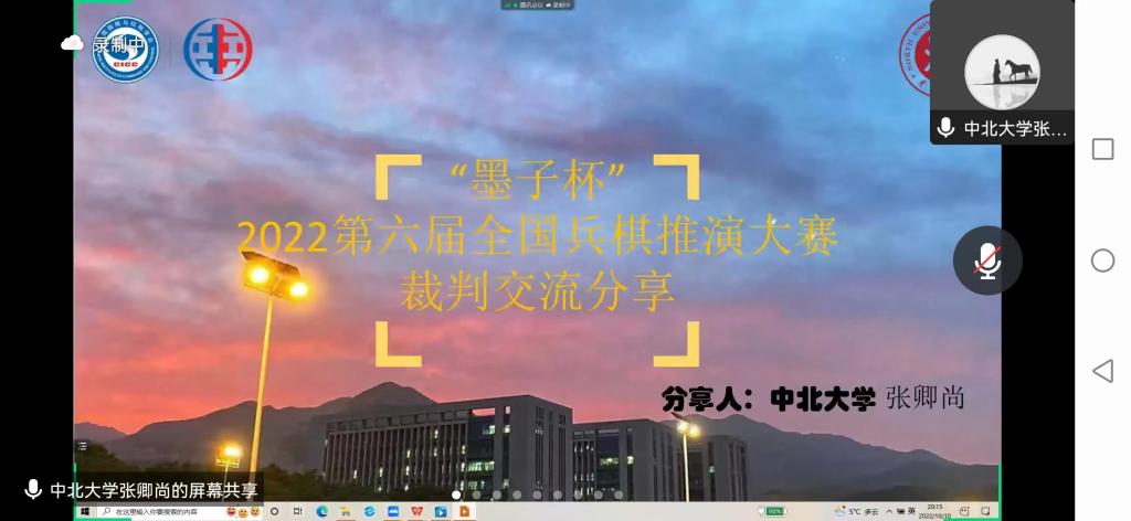 协办的“墨子杯”2022年第六届全国兵棋推演大赛即将开始。为了保证此次大赛的顺利进行,10月10日晚上8点,应全国兵棋推演大赛组委会邀请,我校张卿尚同学为全国兵棋推演大赛导裁进行线上培训会。参加此次培训会主要有大赛组委会负责人张俊、杨南征、张连军等老师,各赛区裁判代表和全体裁判员。