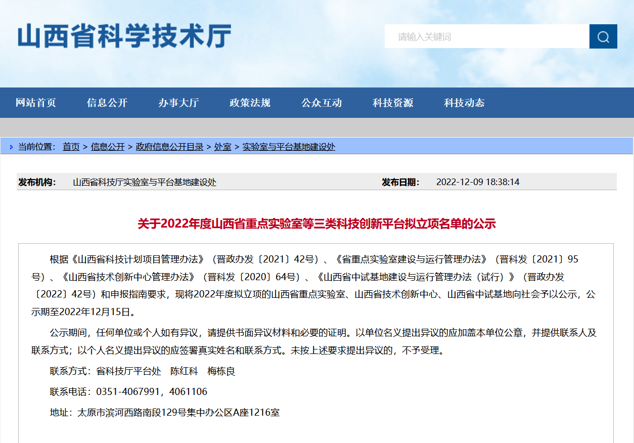根据省科技厅“关于2022年度山西省重点实验室等三类科技创新平台拟立项名单的公示”,熟女av