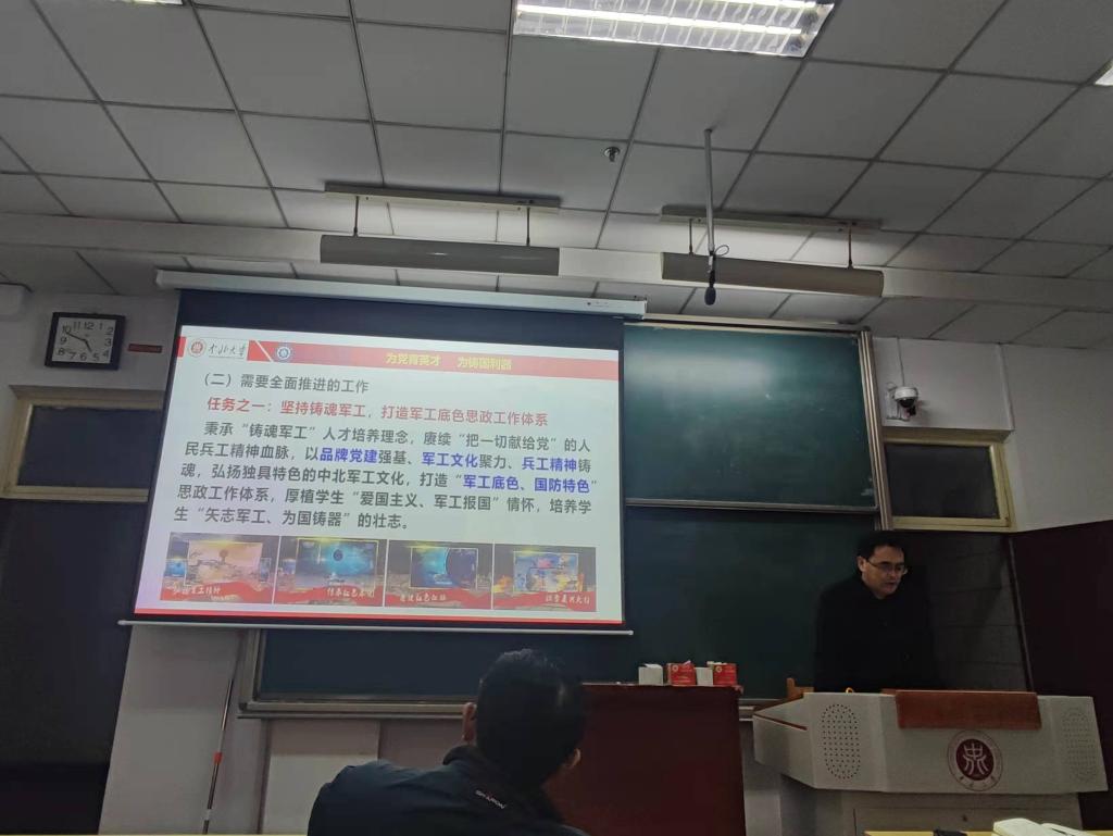 尹建平院长首先回顾了过去一年来学院在党建工作、学科建设、三全育人、人才培养、师资队伍、教学科研、学院声誉等方面取得的优秀成绩,感谢大家为学院圆满完成年度各项工作任务的辛勤付出,表示学院取得的长足进步与每一位教职工的努力密不可分。并重点对2023年学院工作计划进行了安排部署,主要推进以下十个方面的工作:一是坚持铸魂军工,着力构建“军工底色”思想政治工作体系,二是聚焦课程育人,精心打造“大国系列”特色品牌,三是弘扬军工文化,创新建设“军工系列”特色课程,四是坚持人才强院,着力推动高水平师资队伍建设;五是坚持学科引领,夯实高水平特色学院建设之基;六是坚持以本为本,深化兵器类人才培养模式改革;七是立足行业需求,加强兵器卓越工程师培养;八是坚持国防特色,持续巩固增强国防科研优势;九是坚持创新引领,提高大学生创新创业实践能力;十是坚持事业引领,提高兵器类专业就业质量水平。最后,尹建平院长指出:大家一定要牢记“为党育人、为国育才”使命,以立德树人为根本任务,以提升人才培养质量为目标,传承“把一切献给党”的人民兵工精神,秉承“国防特色立院、兵器学科强院、军工文化荣院、人才培养质量兴院”理念,开拓创新、攻坚克难、敢于担当、主动作为,从而全面提高学院整体发展水平,为学校创建“双一流”作出贡献!