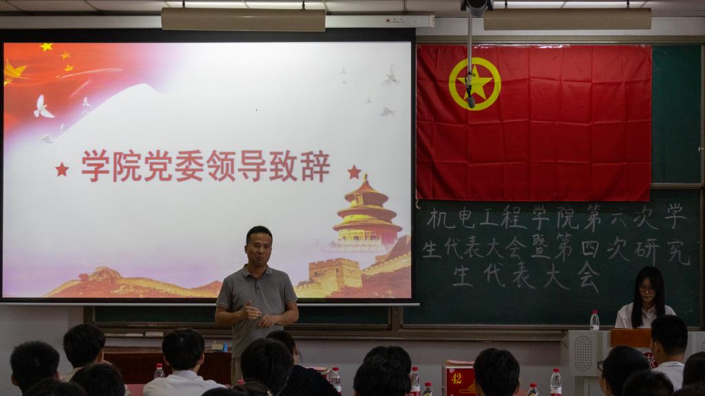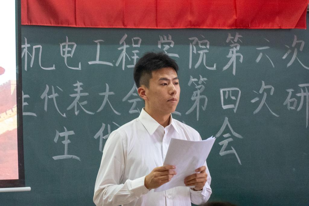 研究生代表大会的批复》和兄弟学院发来的贺信后,上一届学生委员会主席团成员秦鹏做工作报告,分析总结了上一学年学生会各部门的工作任务完成情况与各项活动举办情况,学生会取得了一系列令人瞩目的成绩,同时也对下一届学生会工作提出建议,希望全体学生骨干有责任、有担当,以更饱满的热情,投入到服务同学中去。