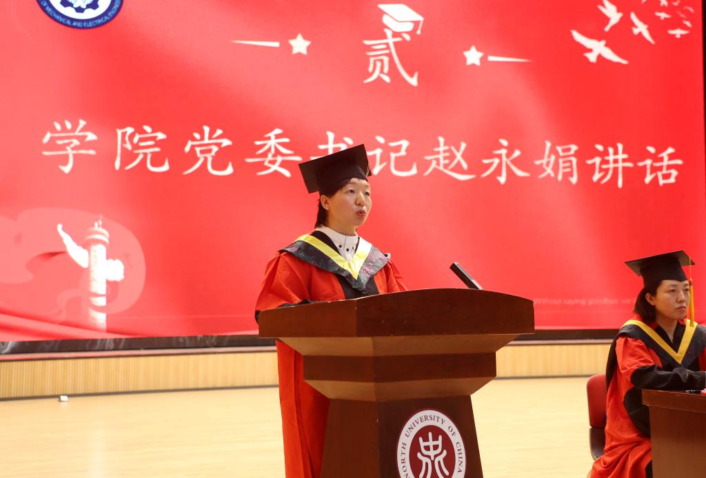 毕业典礼在全院师生奏唱庄严的国歌声中拉开序幕,赵永娟书记讲话,她回顾了四年中2024届毕业生所取得的成绩,肯定了他们是军工精神传承的时代好青年。她叮咛同学们:第一,新征程上,希望心怀家国,不懈奋斗。只有赤心爱国,军工报国,到祖国最需要的地方去展现才华,到人民最需要的地方去挥洒青春,才能成为最好的自己;第二,新征程上,希望脚踏实地,做好规划。她用“人生·工作的结果=思维方式*热情*能力”这样一个公式,希望同学们做好规划,开好人生的新篇章;第三,新征程上,希望自信自立,勇挑重担。希望大家积极践行“把一切献给党”的人民军工精神,学好本领技能,自信自立,为军工国防的建设贡献自己的力量;第四,新征程上,希望心怀感恩,踏实为人。她以80级齐侠校友为学院捐赠100万元奖教金的感恩故事讲起,希望同学们走向社会后,心怀感恩,以感恩之心奉献祖国和人民,为母校增光添彩。
