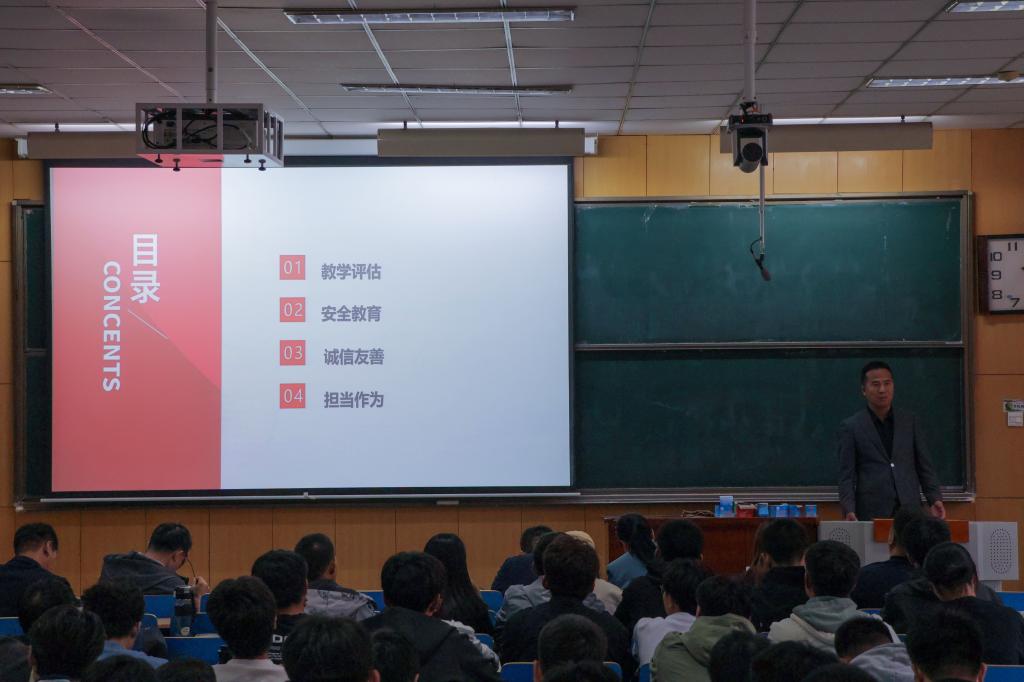 会议开始,刘书记分别从教学评估、安全教育、诚信友善、担当作为四个方面进行讲述。刘书记指出:当前,教学评估是学校的一项重要工作,每位学生都要全心投入课堂,远离手机干扰,遵守上课纪律。对于学校的特色亮点优势要正面客观宣传,对于尚待完善之处要从建设性角度入手,展示中北学子优秀的综合素质和积极向上的精神风貌。
