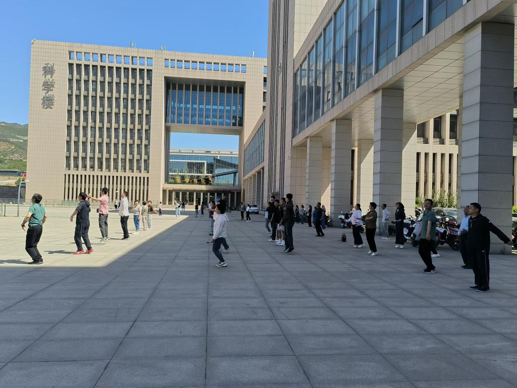 每周二、周四上午10点,随着轻快的音乐响起,教职工们暂时放下手头工作,齐聚学院楼下广场,良好的精神风貌,整齐化一的动作,成为学院一道亮丽的风景线。