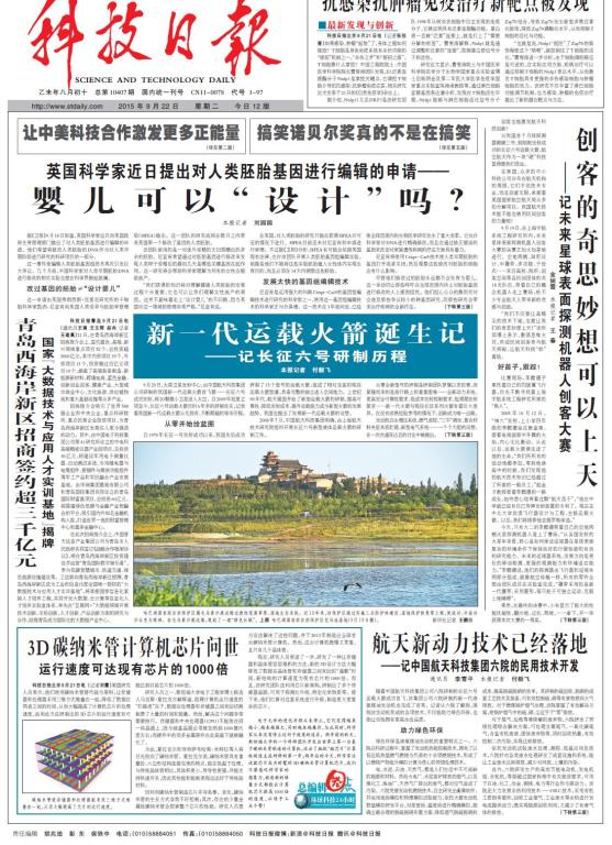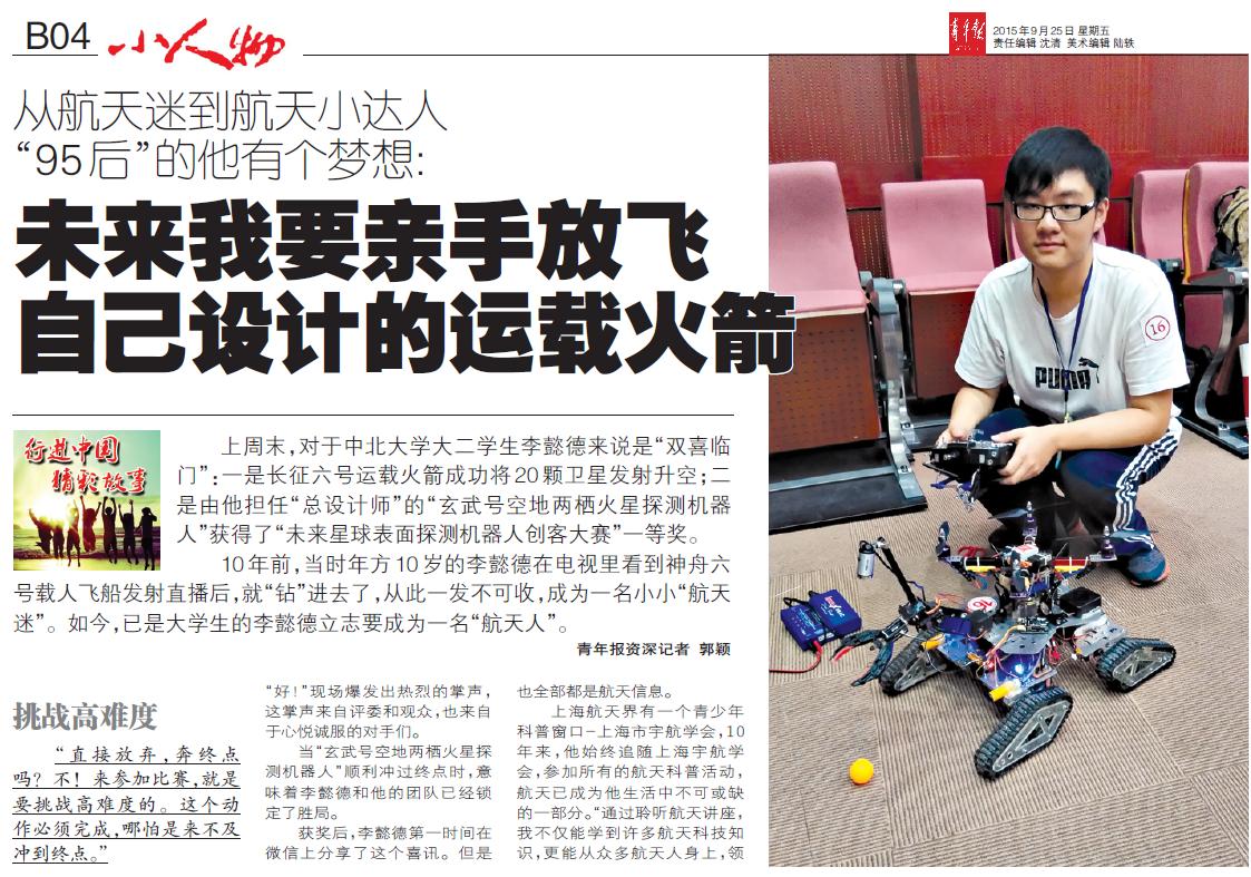 2015年9月19日,我校飞行器设计与工程等专业大二学生李懿德、沈文祥、张炜、王江涛、董立纲在未来星球表面探测机器人创客大赛中获得一等奖。 9 月 22 日 ,科技日报第一版以“创客的奇思妙想可以上天”为题,9月25日青年报以“未来我要亲手放飞自己设计的运载火箭”为题,专题刊登了李懿德同学在科技创新方面的创新历程,扩大了熟女av 在学生科技创新方面的知名度和声誉。