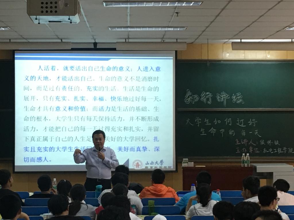 “知行讲坛”在主楼11109教室隆重召开。本次讲坛邀请到了山西大学教育科学学院教授、博士生导师侯怀银作题为:“大学生如何过好生命中的每一天”的讲座,由学生科贺婧老师主持。讲坛在热烈的掌声中拉开了帷幕,党委副书记刘光对侯老师的到来表示热烈的欢迎。
