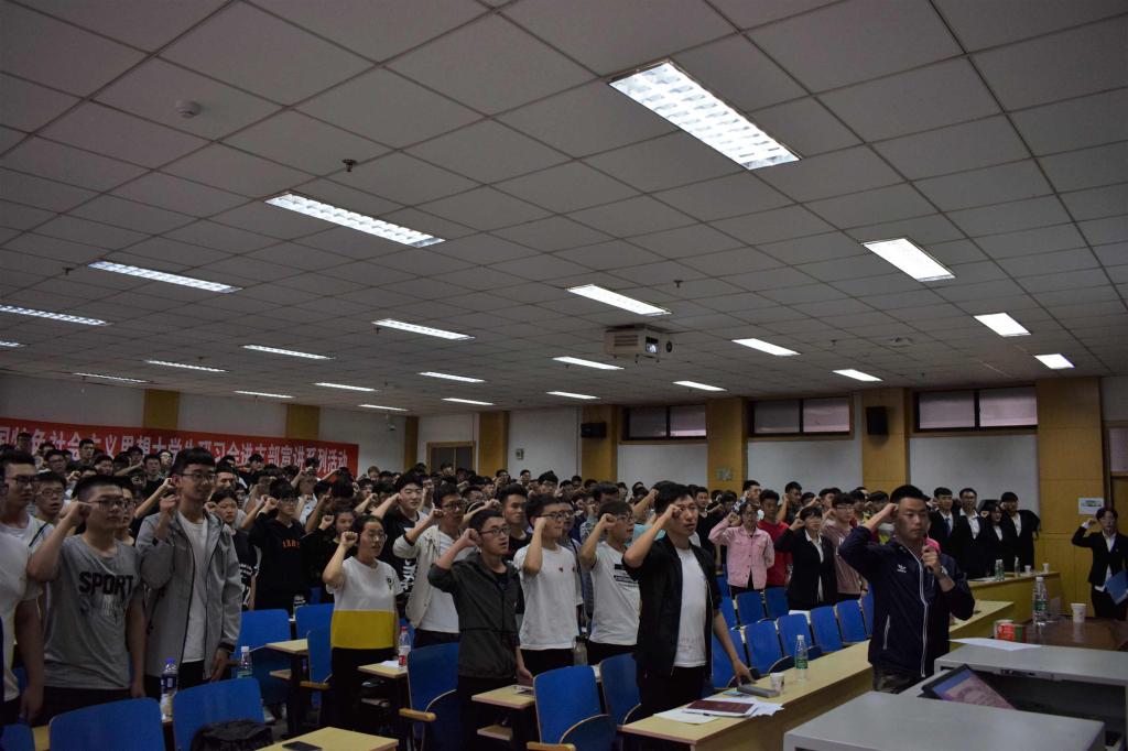 学生代表与研习会会员代表发言,讲述了自己的学习心得,并相互交流,以对本次宣讲会有更深、更广的理解。最后由研习会会长党书畅同学领誓,带领大家重温入团誓词仪式,铿锵有力的话语,彰显了大家对党对对团对祖国的热爱。