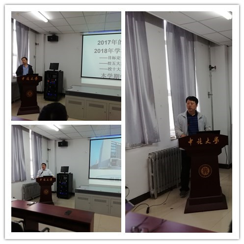 随后,王志军院长回顾了学院2017年工作要点,通报和学习学校2018年学院重点工作和学校改革重点及本学期工作重点,详细介绍了学校五大发展战略,特别强调学校近期开展的人才强校工程、人才质量培养工程、思政教育提升工程、科技攀升工程、学科提升工程、学研合作模式优化工程、资源配置科学化工程、管理服务提升工程、国际化水平提升工程、大学文化教育工程等十大工程。王院长要求全院教师要适应学校的改革发展,以学生为中心,积极主动工作,提升自身能力,服务国防,服务地方。