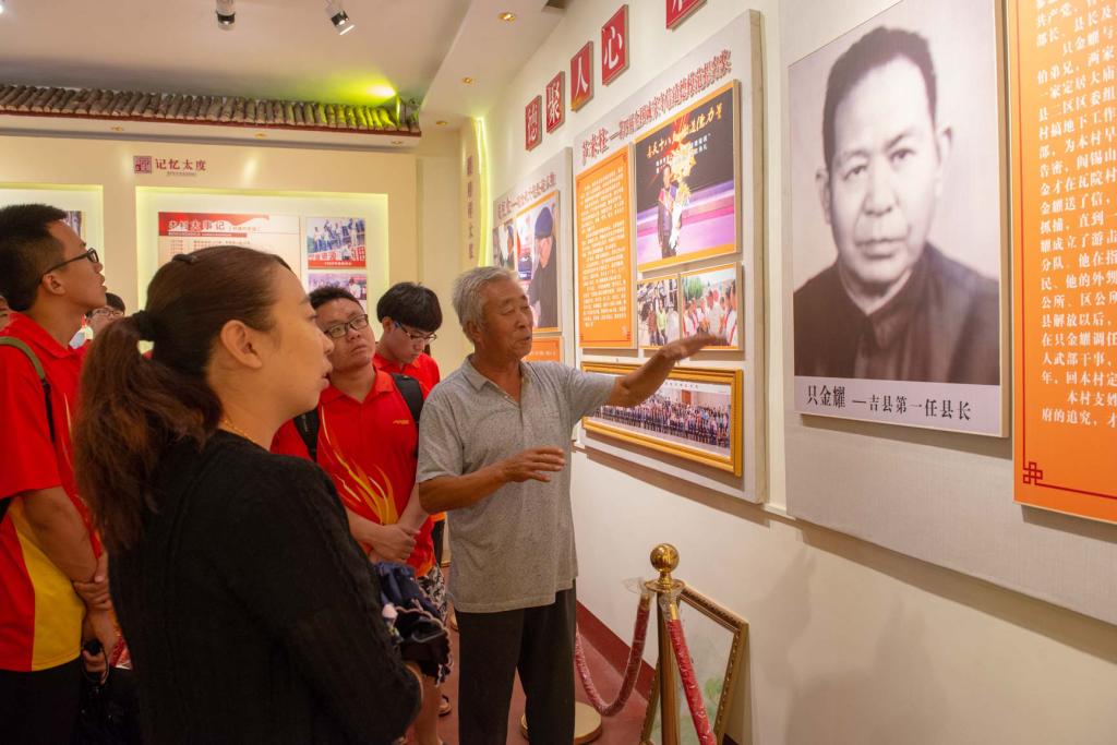 随后我们来到了村德村史馆,在村主任的带领和解说下,村德村史馆的帷幕渐渐被拉开。太度村的底蕴建设大体可以分为五个方面,即记忆太度、榜样太度、文化太度、规矩态度和诚信态度。村实馆建立的目的是记载村官的任期和一些比较大的村事,并完善对村民的教育,使家庭和谐和睦。“一块黑板报,教育一村人”,胡祖金,一位将自己的晚年奉献给村子法律教育的老人,用自己的行动,将村子的混乱局面逐步拉上正轨。芦来柱,村子里的道德模范,为村里人做榜样。只金耀,第一任吉县县长,村子中改只为支姓的第一代人。榜样的力量无穷,正是因为这些人,吉县才能一步步走向今天。九九重阳,二十八年的传承,太度真正把态度融入了文化。太度村的晒被子活动,提高了整村的文化凝聚力;抓住两头重视,重视老人,老人是村子里的历史,重视娃娃,娃娃是村子里的希望;重视教育。也正是因为太度村对这些精神文明的重视,才被评为全国文明村。没有规矩,不成方圆。太度村的村规民约,墙上的最美家训,象征着太度村村民对规矩和家庭教育的重视。这些不是约束,而是村子能走到今天局面的重要保障。讲诚信,是生而为人最基本的道德品质。村德村史馆上书的五大太度照见的正是太度村人一路走来的文化自信,正如镇政府 里 的那句话, “ 讲道理,有品行。讲奉献,有作为。讲政治,有信念。讲规矩,有纪律。 ”