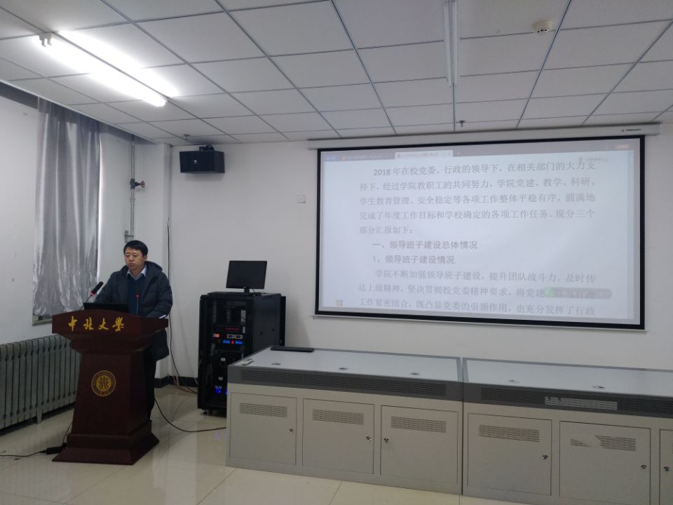 首先,学院党委书记罗建国从领导班子建设、党风廉政建设、意识形态责任制、中心组理论学习四个方面对学院领导班子建设总体情况进行汇报;从党建工作、学科建设、本科生培养、研究生培养、科学研究、师资队伍建设、学团工作、招生与就业工作、国际交流与合作等九个方面对学院2018年度目标任务的完成情况做了详细汇报;对于学院的改革、创新及标志性成果,从学科专业水平、人才培养质量、科学研究能力等三个方面做了汇报。随后,罗建国书记和王志军院长分别结合各自工作做了2018年度个人述职述廉报告,对全院师生全力支持学院领导班子和个人工作表示衷心的感谢!