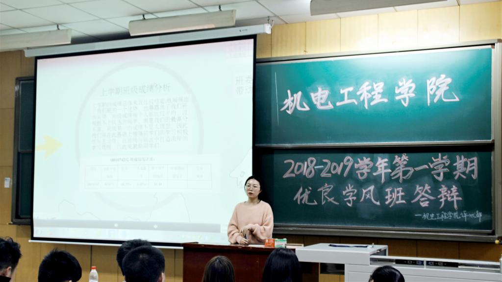 在答辩环节,各班代表分别从班级简介、学风举措、获得成绩、未来展望等几个模块向在场师生介绍了本班优良学风建设的情况;以学期内的优良学风建设为出发点和着力点,着重展示了在优良学风熏陶下班级的成绩进步和荣誉收获。本次优良学风班评选,各班以PPT和演讲的形式,通过班级均分、考试优秀率、英语四六级通过率、党员数量、考研人数等具体指标,向全院师生描绘出机电工程学子勤学日新、积极进取、青春逐梦的画面,勾勒出一幅幅属于班级的逐梦宏图。