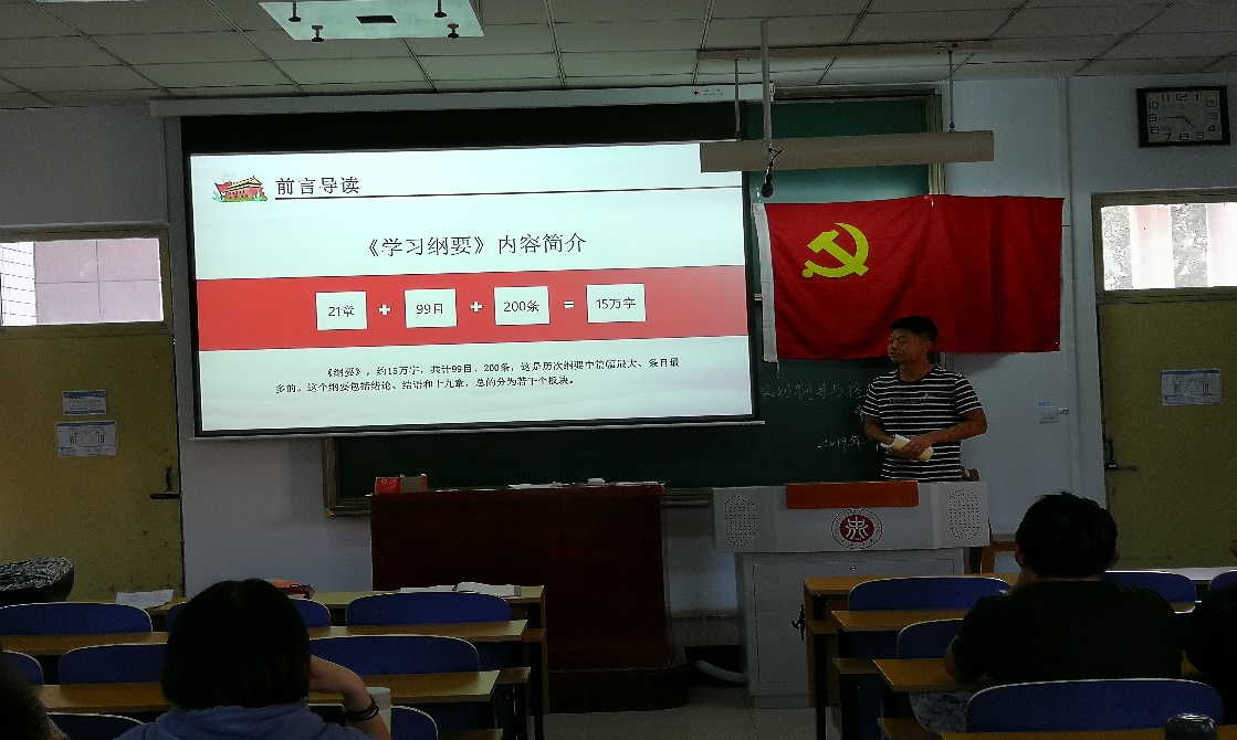 首先,纪检委员肖金沛同志先给大家讲解了《学习纲要》怎么学的问题,他主要从习近平新时代中国特色社会主义思想、中国特色社会主义进入新时代、当代中国发展进步的根本方向以及坚持以人民为中心这四个方面进行了阐述,同时还给大家播放了一则关于青春与奋斗的小视频,希望大家能够不负青春韶华,敢于追逐梦想。