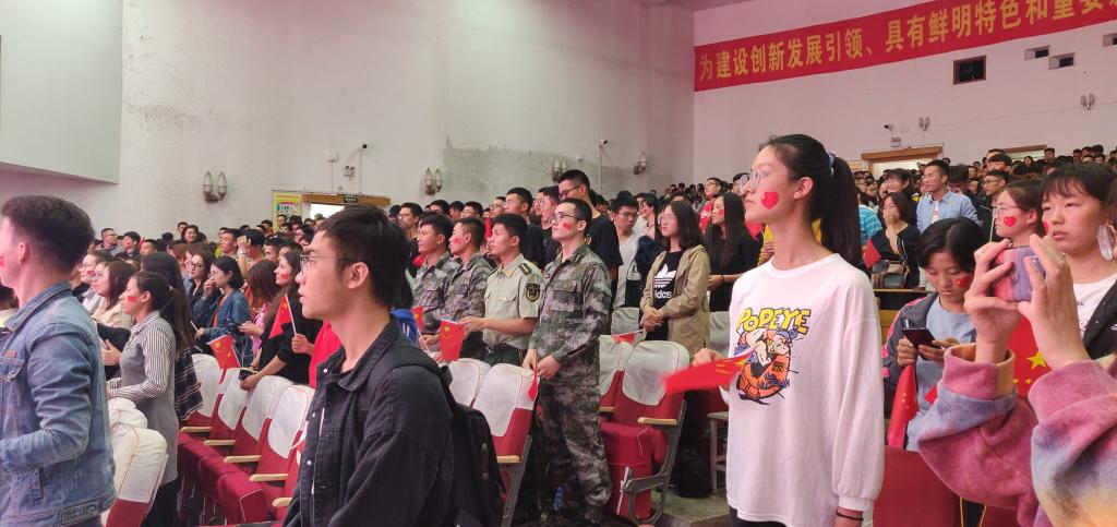 退役大学生士兵代表、少数民族代表、教职工代表以及国旗护卫队共同观看了庆祝中华人民共和国成立七十周年阅兵盛典。整个会场气氛热烈且秩序井然,会场座无虚席,很多同学都站立在两侧,在阅兵式正式开始之前,大家首先观看了开国大典的彩色录像,感受到了建国之初全体中国人民在解放之后的欢欣鼓舞之情。随后阅兵直播正式开始,当直播到升旗仪式时,全体与会人员共同起立,跟随直播一同高唱中华人民共和国国歌,大家也共同聆听了习近平总书记的讲话,深刻体会到共和国七十周年来艰苦卓绝的奋进之路。