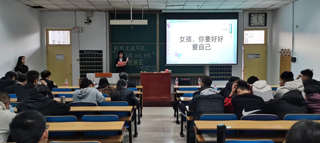 文艺部、学生管理中心启菲源共同主办的关于“自尊自爱 自立自强”主题的座谈会顺利举办并圆满结束。本次讲座不仅为我校女大学生的成长进行指导,也帮助其树立正确的人生观、价值观、恋爱观,提高她们保护自我意识和能力,有利于她们健康成长,对营造良好的校园安全文化氛围起到积极作用。辅导员邢培岩老师参加了此次座谈会。