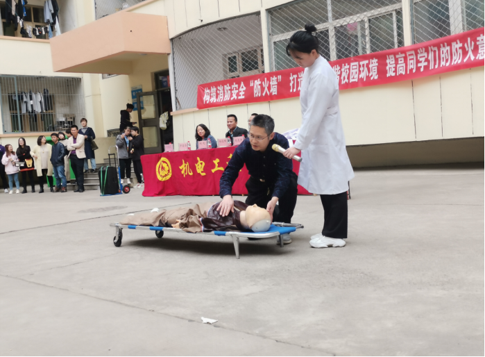 校医院勾虎平大夫对急救知识进行展示和演说,亲自向同学们展示心肺复苏模拟流程等。演习的第三项由安全保卫处教育管理科科长向远峰老师向大家讲解灭火器的使用方法,并安排学生代表动手操作并进行试验。