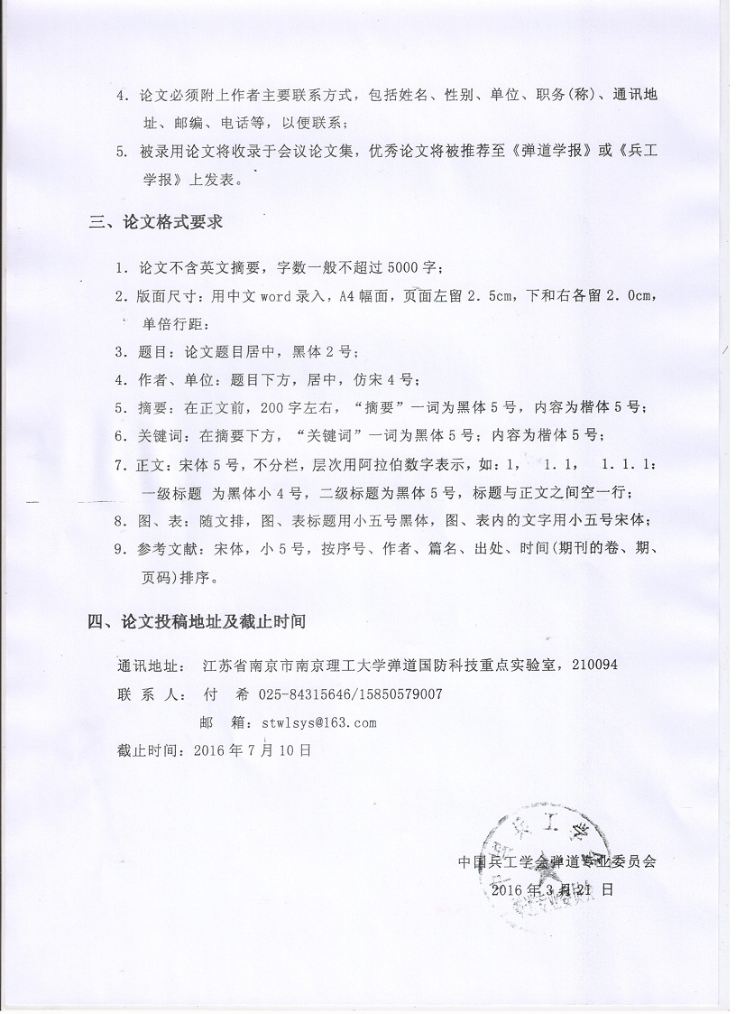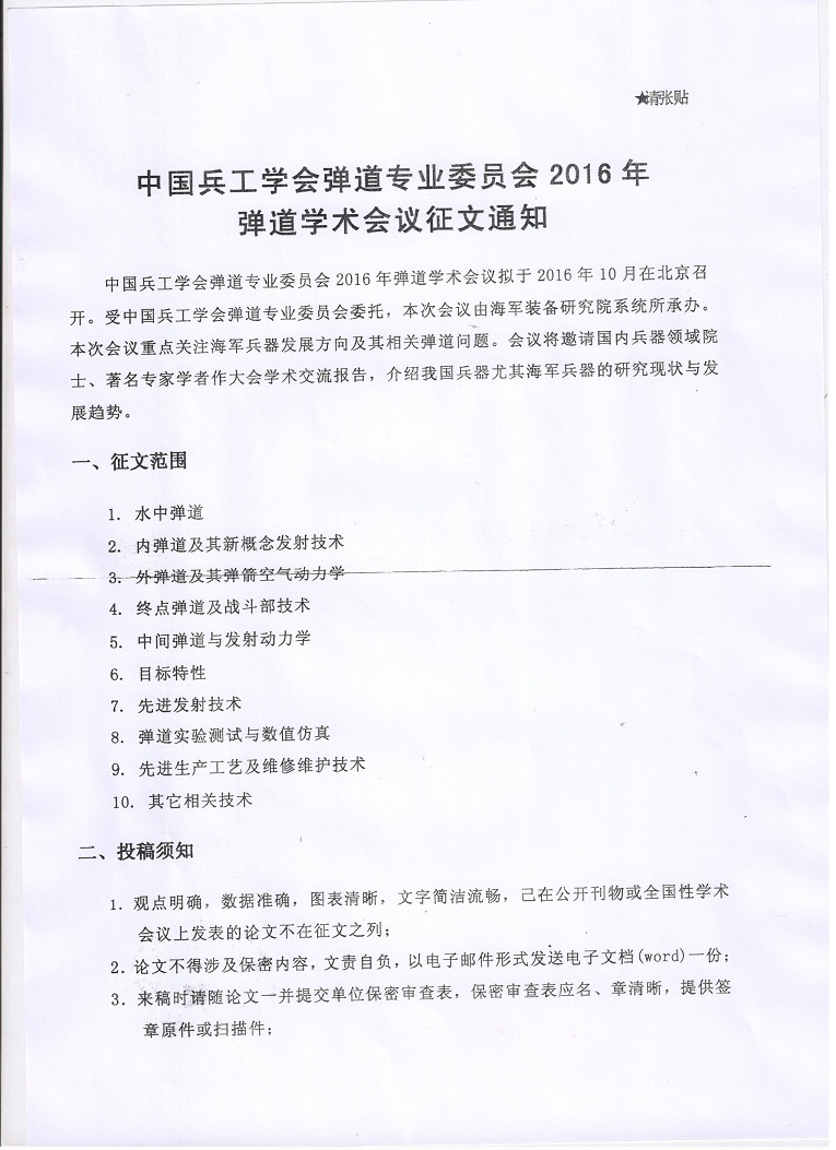 中国兵工学会弹道委员会2016年弹道学术会议征文通知